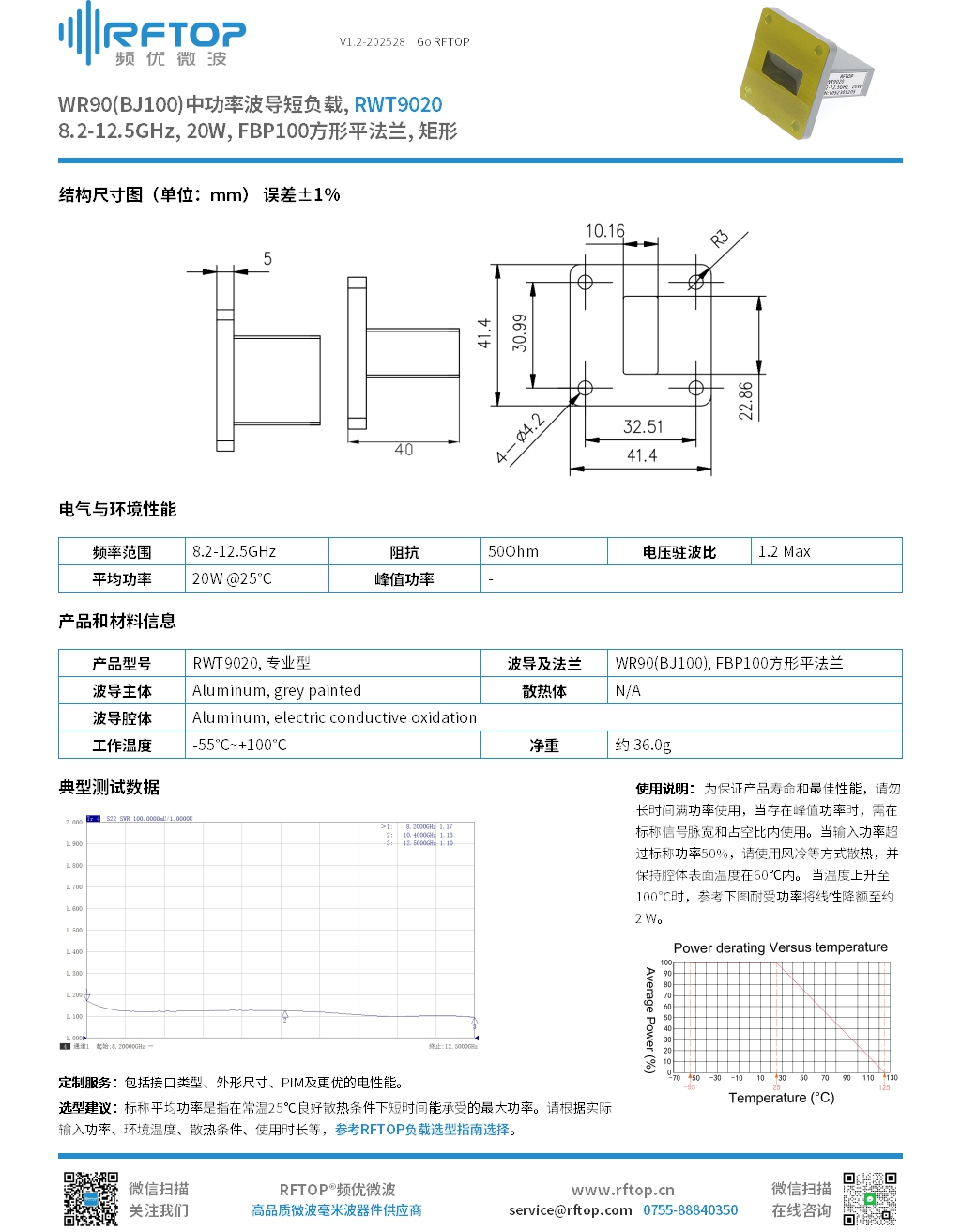 WR90(BJ100)中功率波导短负载|专业型, 8.2-12.5GHz, 20W, FBP100方形平法兰, 矩形 - RWT9020