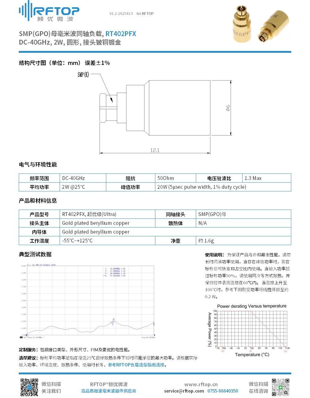 • 商品名称:SMP(GPO)母毫米波同轴负载|专业型, DC-40GHz, 2W, 圆形, 接头铍铜镀金 - RT402PFX