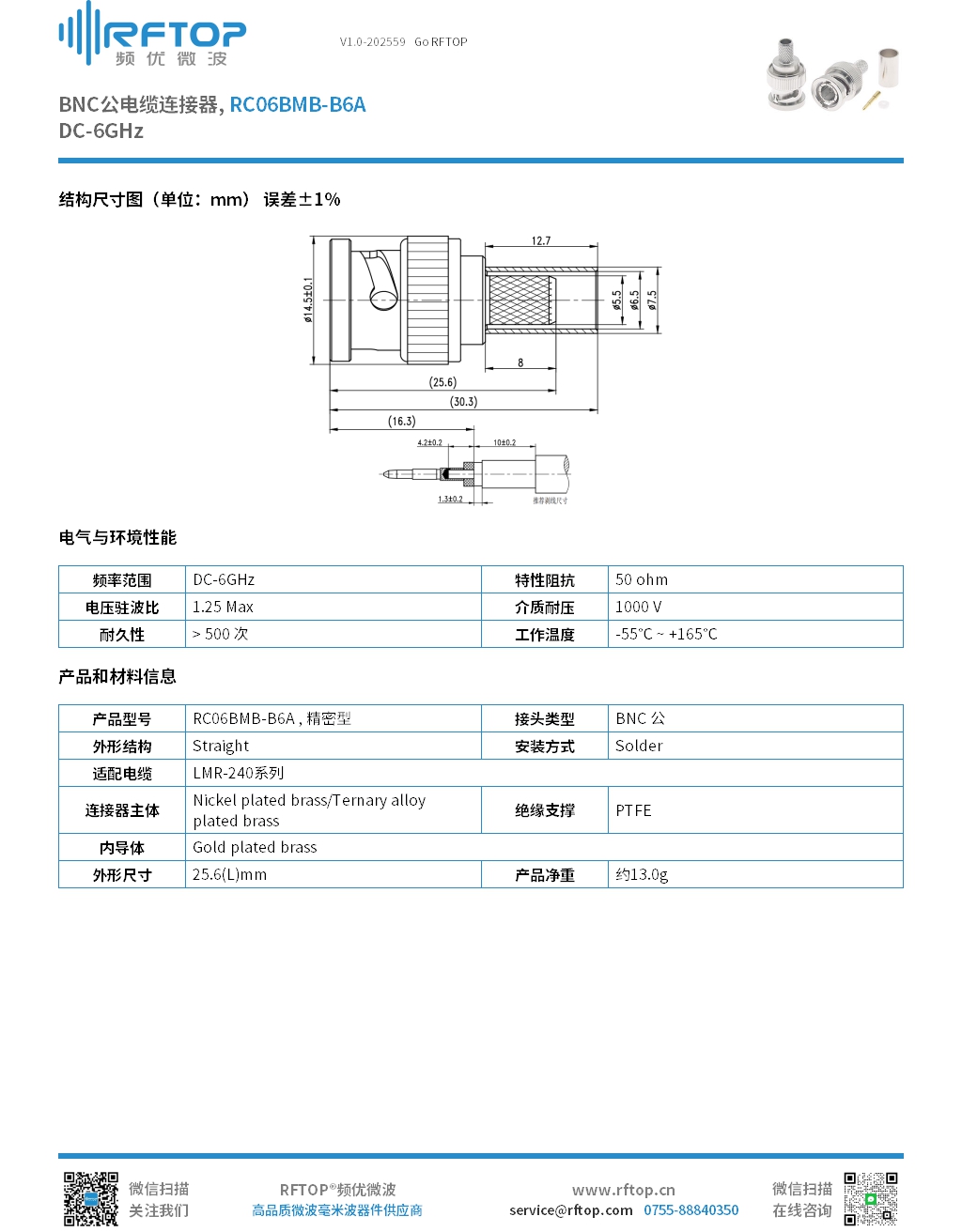 • 商品名称:BNC公电缆连接器|精密型, DC-6GHz - RC06BMB-B6A