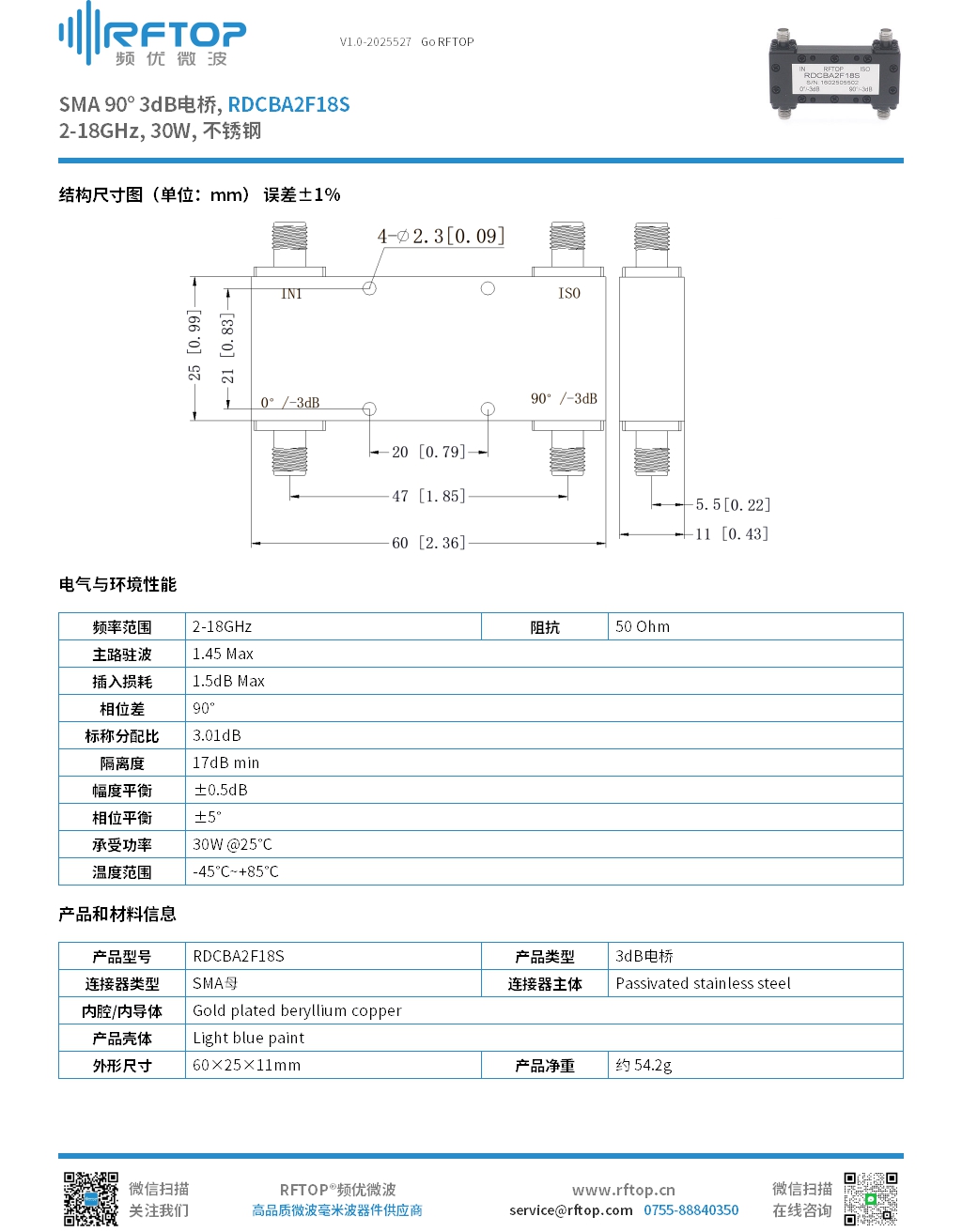 SMA 90° 3dB电桥, 2-18GHz, 30W, 不锈钢 - RDCBA2F18S