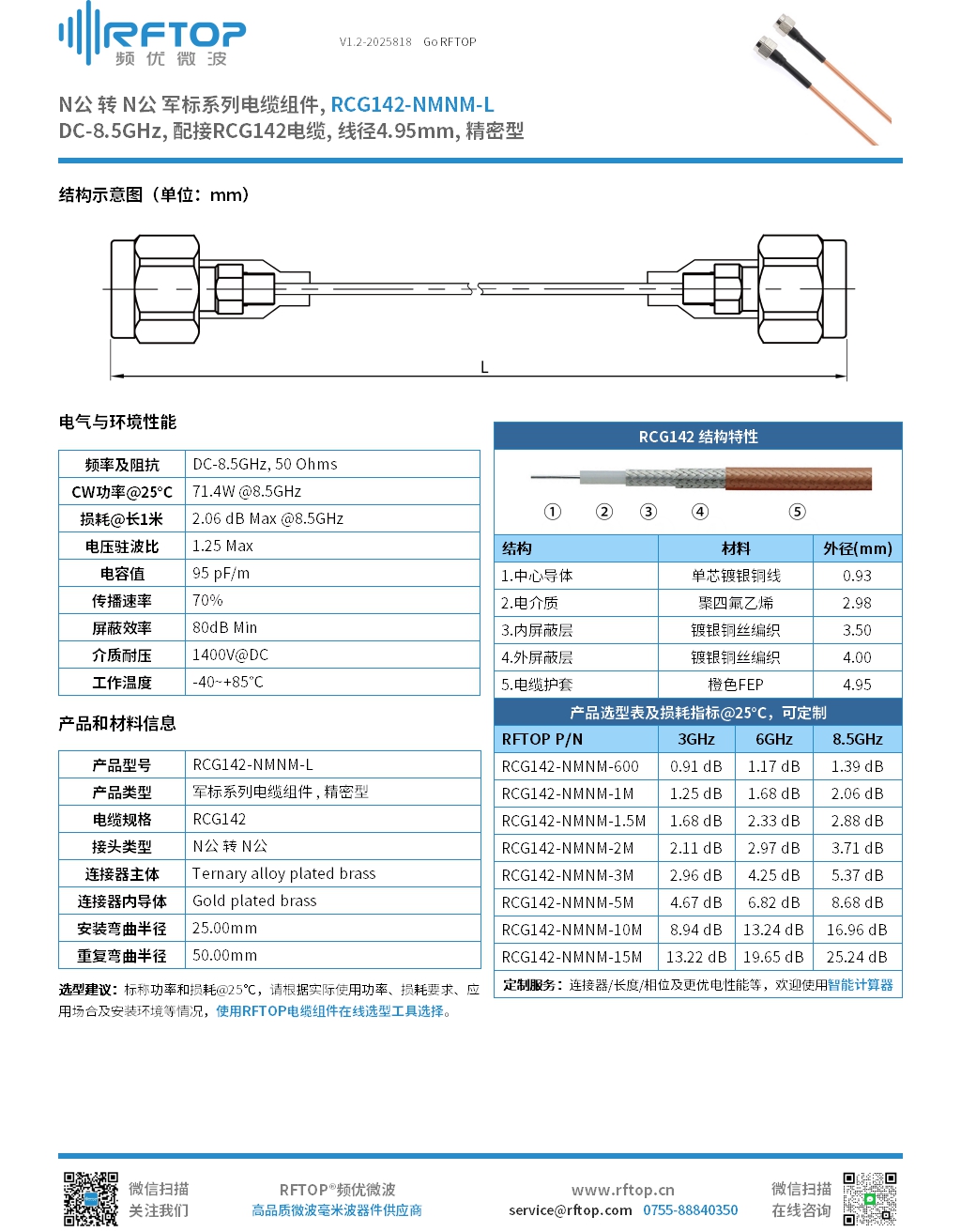 • 商品名称:N公 转 N公 军标系列电缆组件|精密型, DC-8.5GHz, 配接RCG142电缆, 线径4.95mm - RCG142-NMNM-L