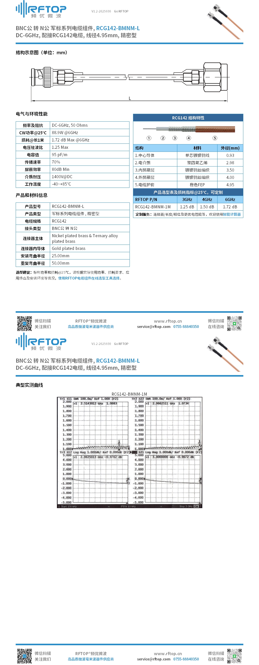 • 商品名称:BNC公 转 N公 军标系列电缆组件|精密型, DC-6GHz, 配接RCG142电缆, 线径4.95mm - RCG142-BMNM-L