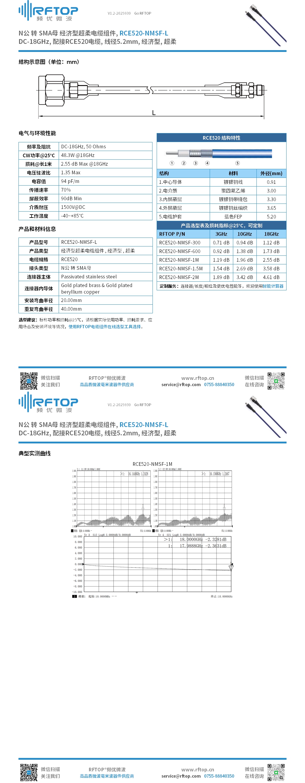 • 商品名称:N公 转 SMA母 经济型超柔电缆组件|经济型, 超柔, DC-18GHz, 配接RCE520电缆, 线径5.2mm - RCE520-NMSF-L