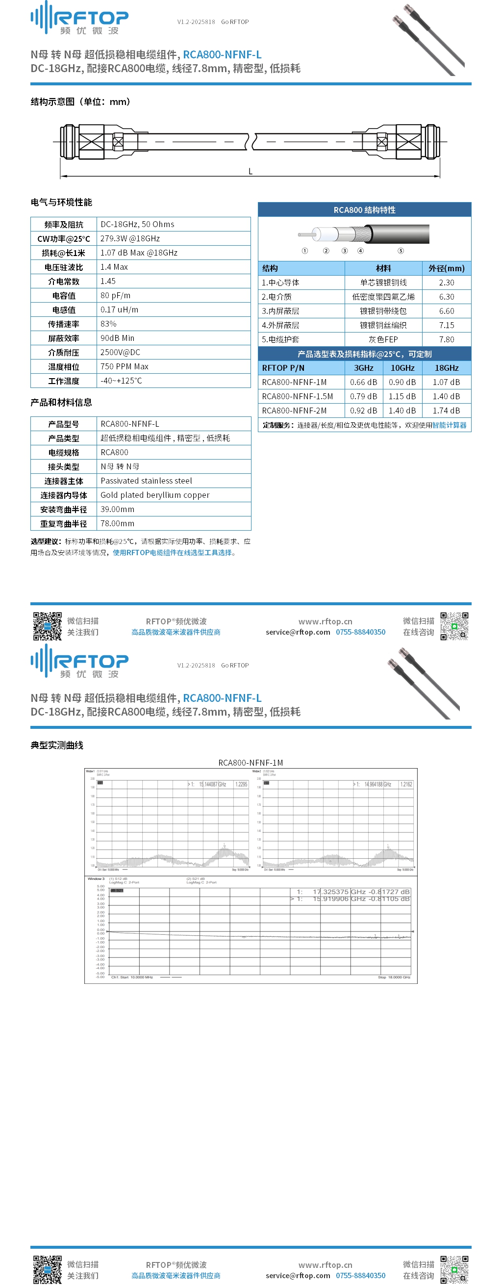 • 商品名称:N母 转 N母 超低损稳相电缆组件|精密型, 低损耗, DC-18GHz, 配接RCA800电缆, 线径7.8mm - RCA800-NFNF-L
