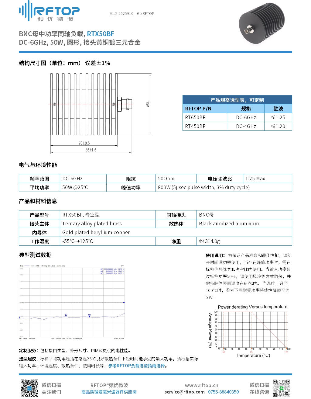• 商品名称:BNC母中功率同轴负载|专业型, DC-6GHz, 50W, 圆形, 接头黄铜镀三元合金 - RTX50BF