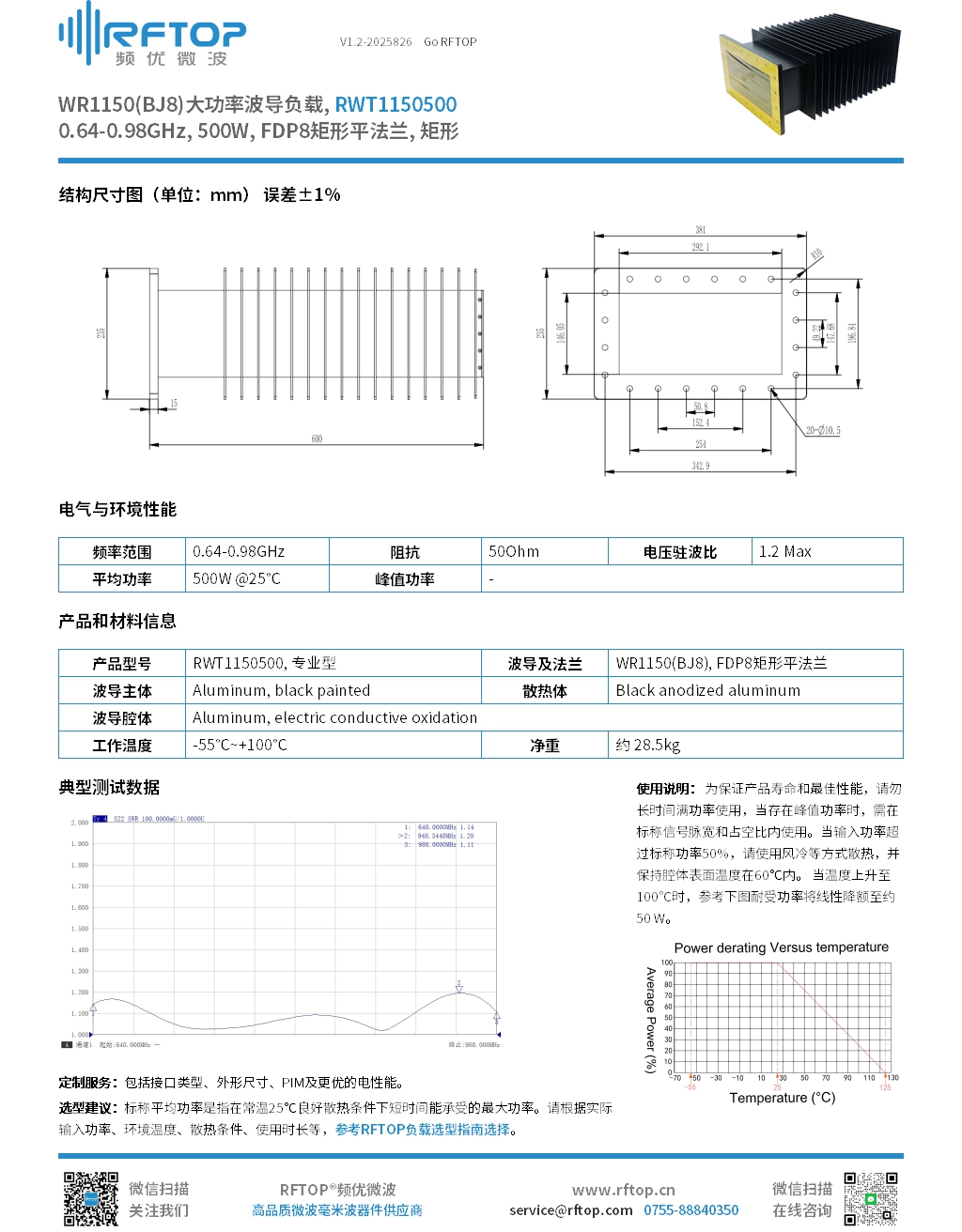 WR1150(BJ8)大功率波导负载|专业型, 0.64-0.98GHz, 500W, FDP8矩形平法兰, 矩形 - RWT1150500