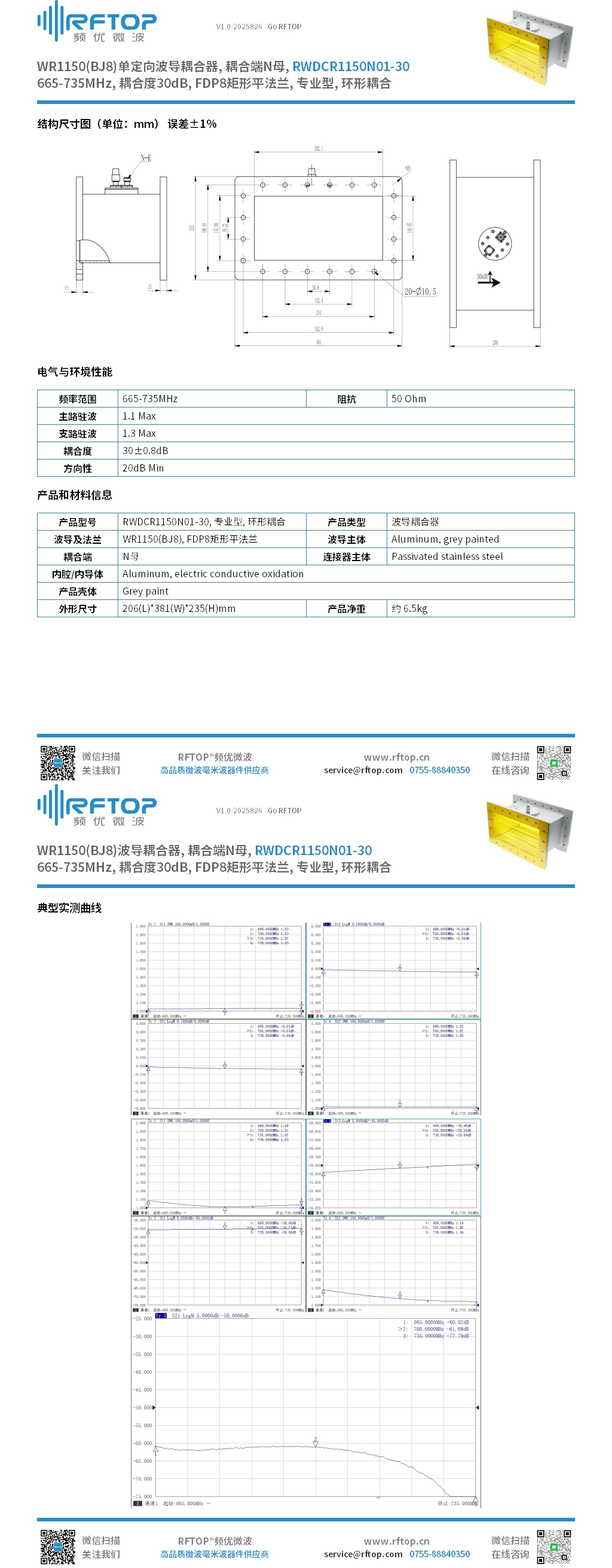 WR1150(BJ8)单定向波导耦合器|专业型, 环形耦合, 耦合端N母, 665-735MHz, 耦合度30dB, FDP8矩形平法兰 - RWDCR1150N01-30