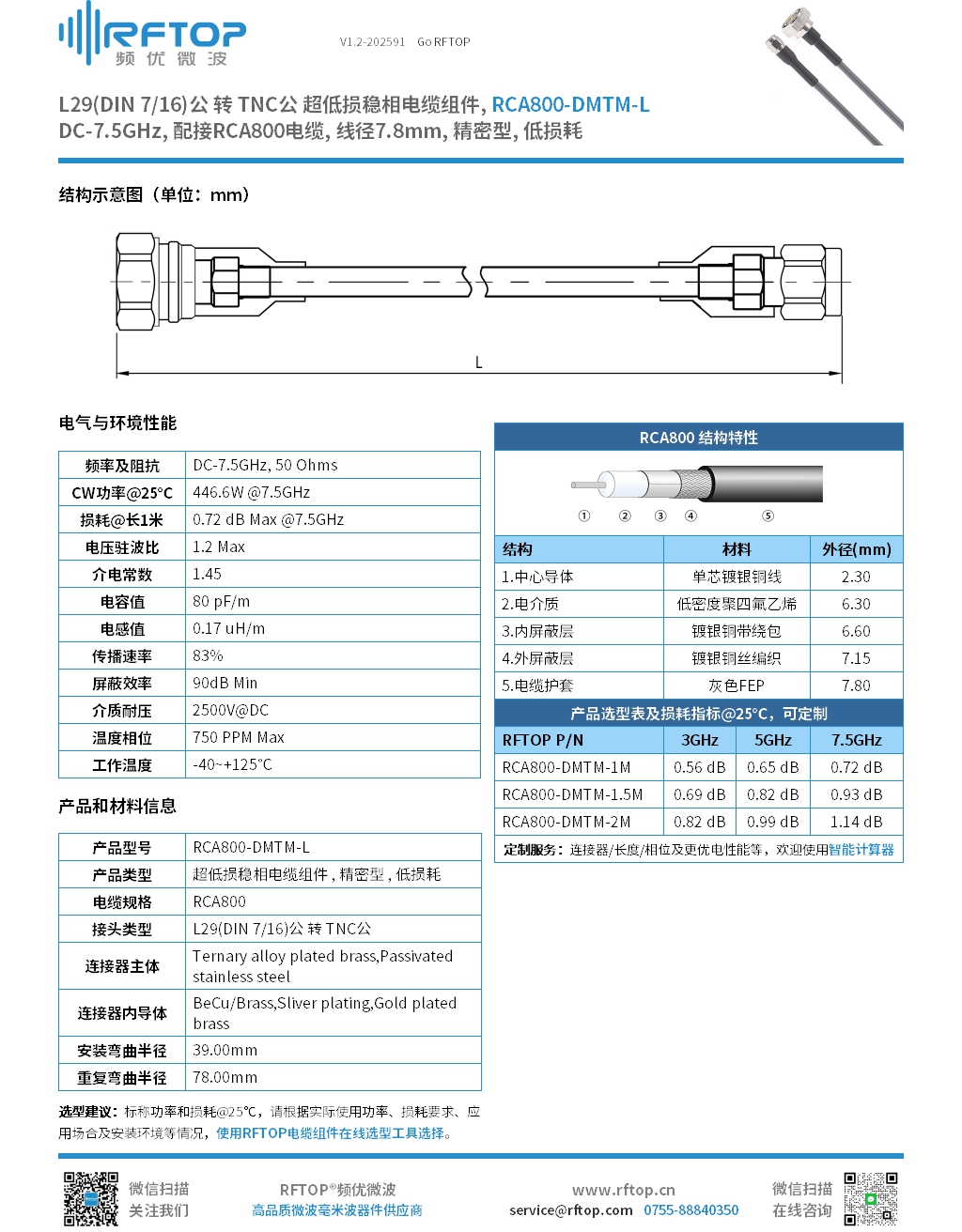 • 商品名称:L29(DIN 7/16)公 转 TNC公 超低损稳相电缆组件|精密型, 低损耗, DC-7.5GHz, 配接RCA800电缆, 线径7.8mm - RCA800-DMTM-L