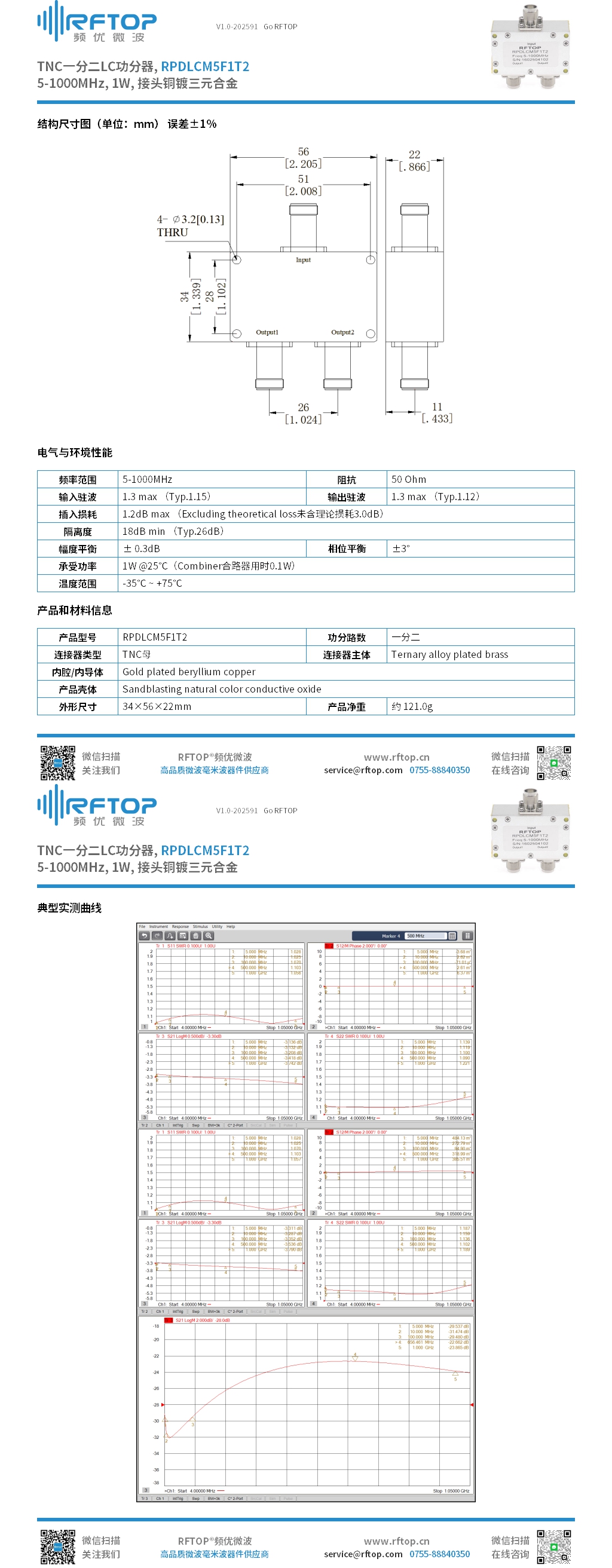 TNC一分二LC功分器, 5-1000MHz, 1W, 接头铜镀三元合金 - RPDLCM5F1T2