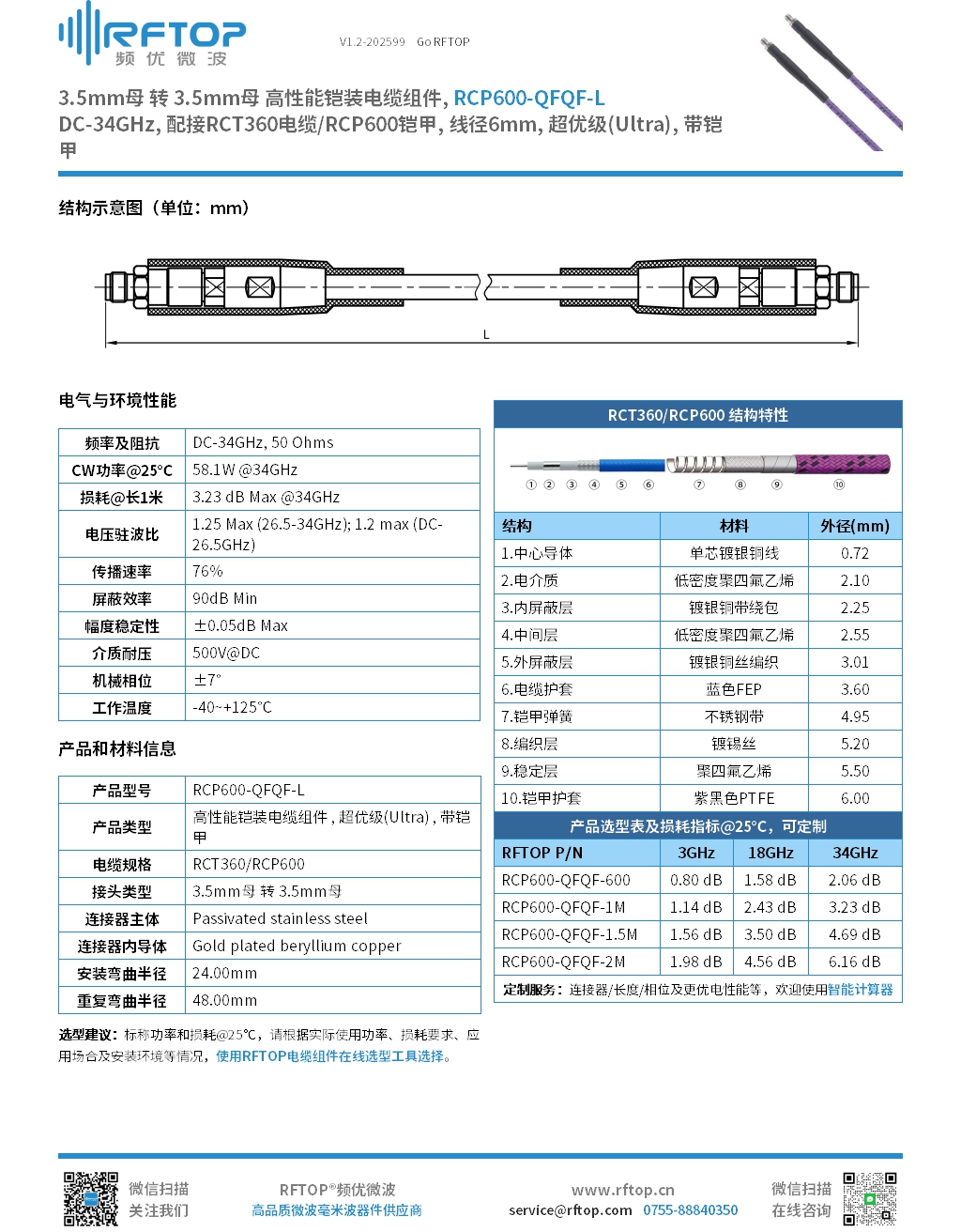3.5mm母 转 3.5mm母 毫米波高性能铠装电缆组件|超优级(Ultra), 带铠甲, DC-34GHz, 配接RCT360电缆/RCP600铠甲 , 线径6mm - RCP600-QFQF-L