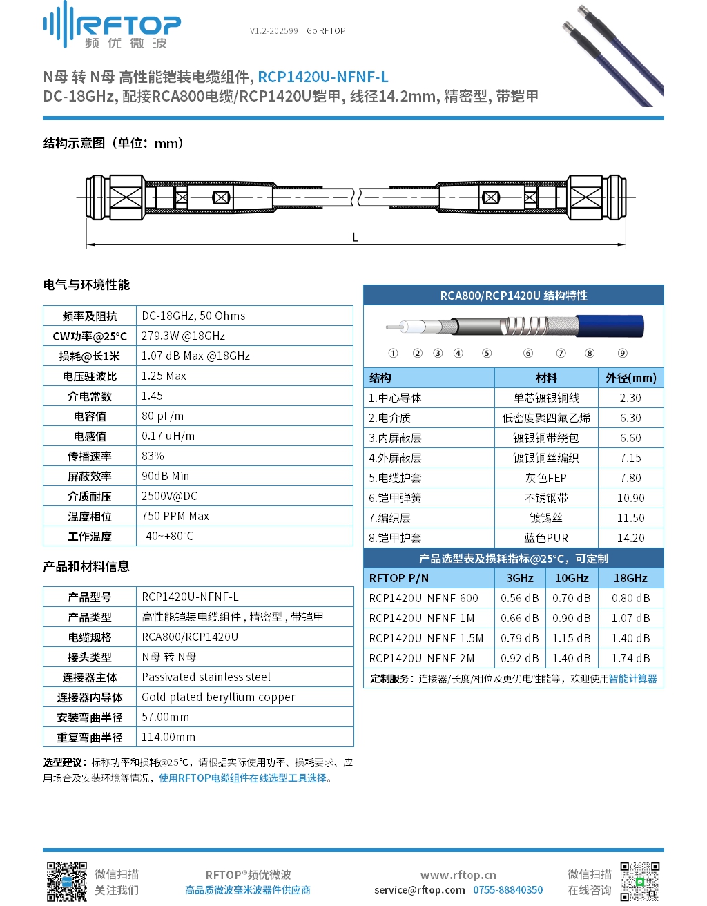 • 商品名称:N母 转 N母 高性能铠装电缆组件|精密型, 带铠甲, DC-18GHz, 配接RCA800电缆/RCP1420U铠甲 , 线径14.2mm - RCP1420U-NFNF-L