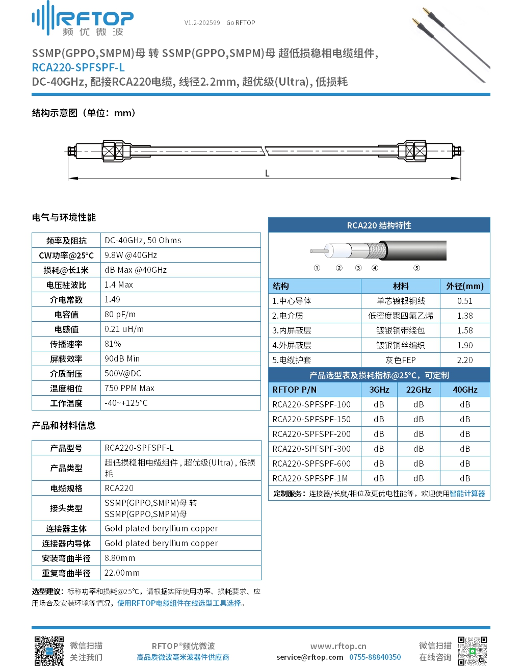 SSMP母 转 SSMP母 毫米波超低损稳相电缆组件|超优级(Ultra), 低损耗, DC-40GHz, 配接RCA220电缆, 线径2.2mm - RCA220-SPFSPF-L