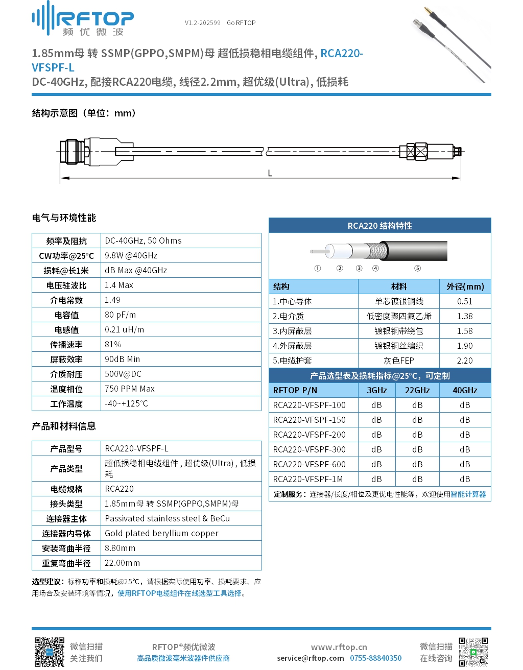 1.85mm母 转 SSMP(GPPO,SMPM)母 毫米波超低损稳相电缆组件|超优级(Ultra), 低损耗, DC-40GHz, 配接RCA220电缆, 线径2.2mm - RCA220-VFSPF-L