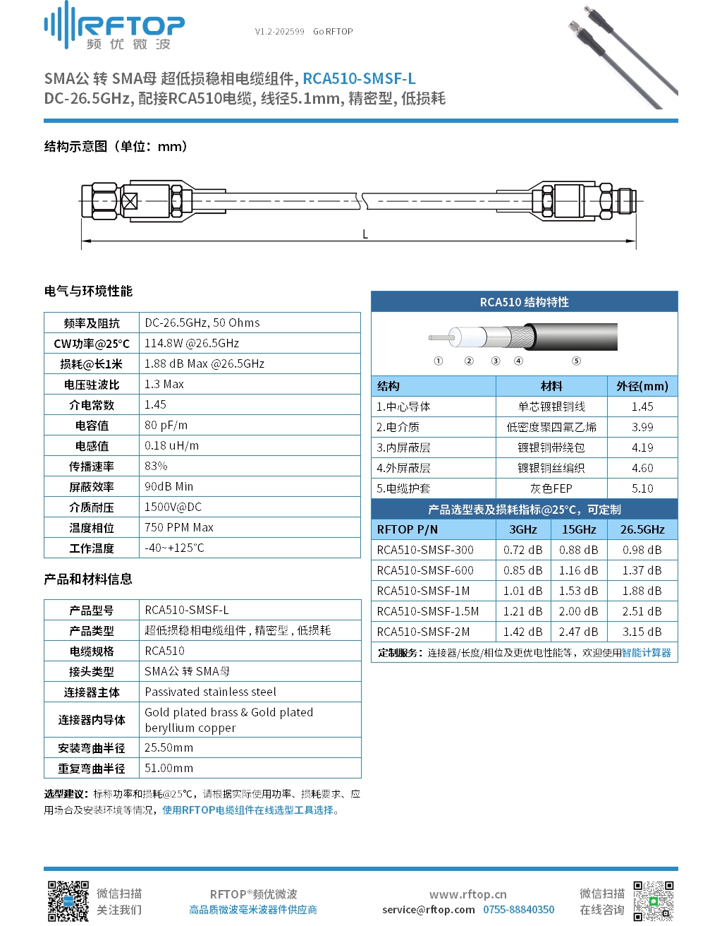 • 商品名称:SMA公 转 SMA母 超低损稳相电缆组件|精密型, 低损耗, DC-26.5GHz, 配接RCA510电缆, 线径5.1mm - RCA510-SMSF-L