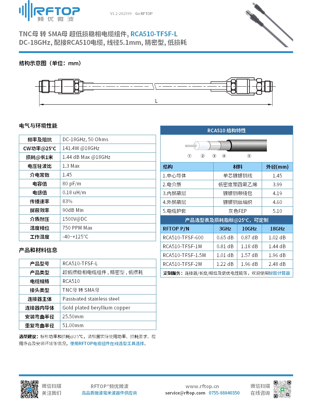 • 商品名称:TNC母 转 SMA母 超低损稳相电缆组件|精密型, 低损耗, DC-18GHz, 配接RCA510电缆, 线径5.1mm - RCA510-TFSF-L