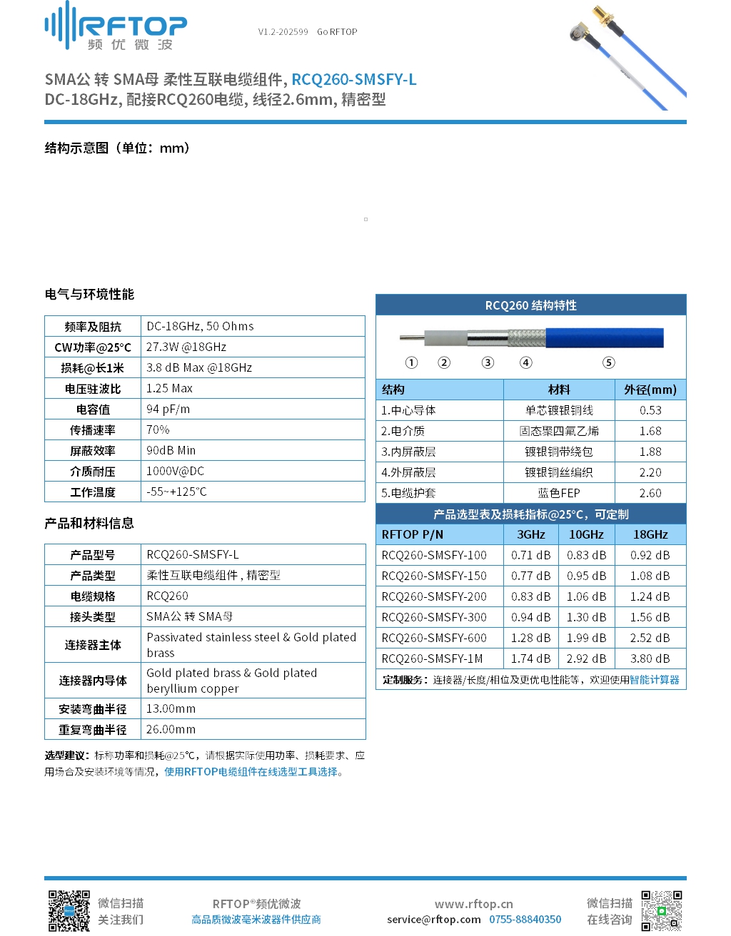 • 商品名称:SMA公 转 SMA母 柔性互联电缆组件|精密型, DC-18GHz, 配接RCQ260电缆, 线径2.6mm - RCQ260-SMSFY-L
