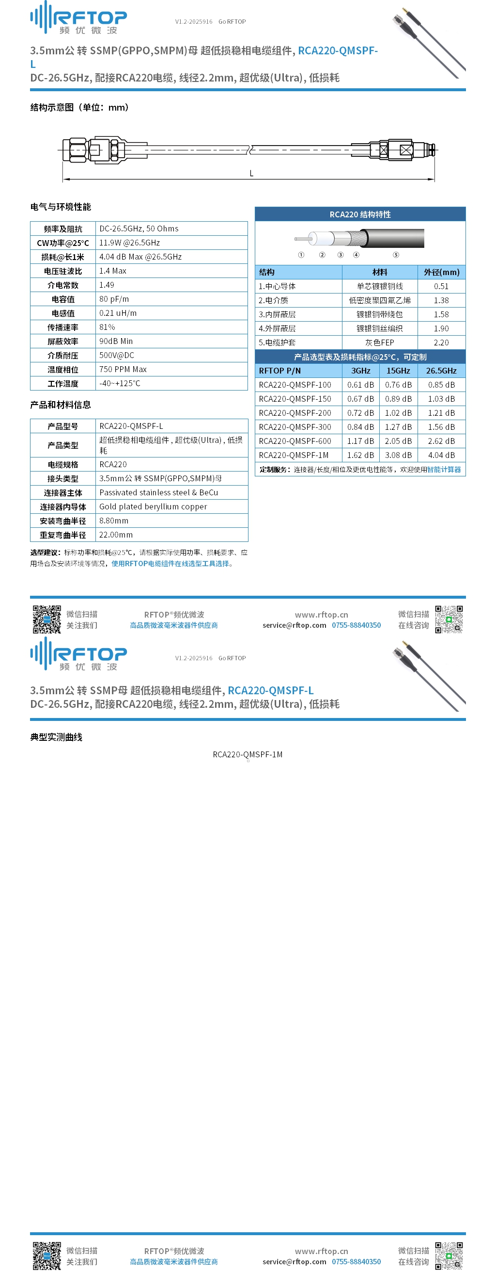 3.5mm公 转 SSMP(GPPO,SMPM)母 超低损稳相电缆组件|超优级(Ultra), 低损耗, DC-26.5GHz, 配接RCA220电缆, 线径2.2mm - RCA220-QMSPF-L