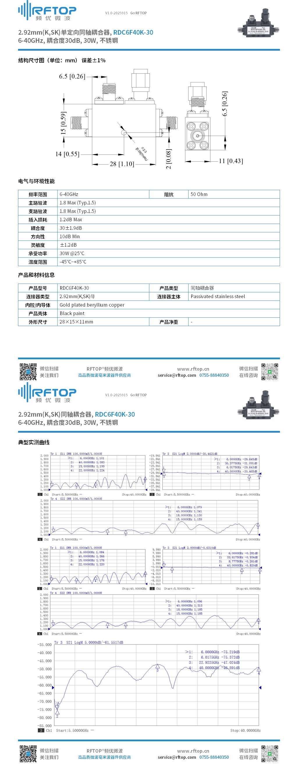 2.92mm(K,SK)单定向同轴耦合器, 6-40GHz, 耦合度30dB, 30W, 不锈钢 - RDC6F40K-30