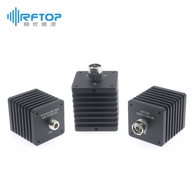 N中功率同轴固定衰减器|专业型, 小尺寸版, 双向, 公-母, 矩形, 接头铜镀三元合金, DC-8.5GHz, 50W - R8N50AB-XX