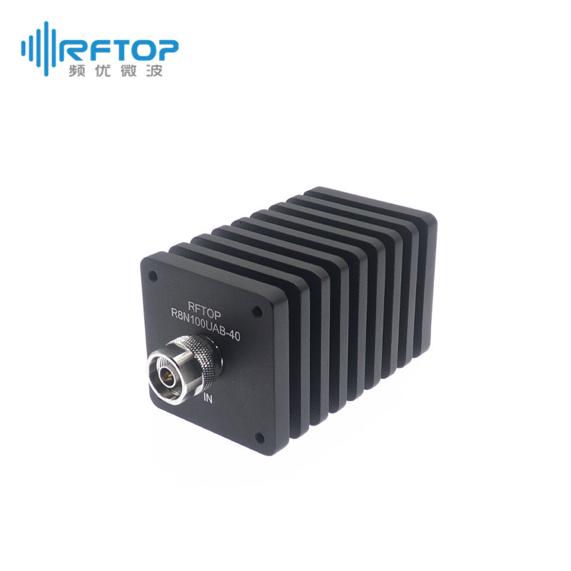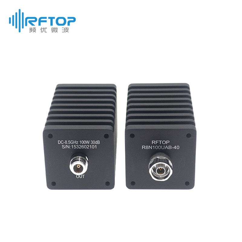 N大功率同轴固定衰减器|专业型, 小尺寸版, 单向, 公输入, 母输出, 矩形, 接头铜镀三元合金, DC-8.5GHz, 100W - R8N100UAB-XX
